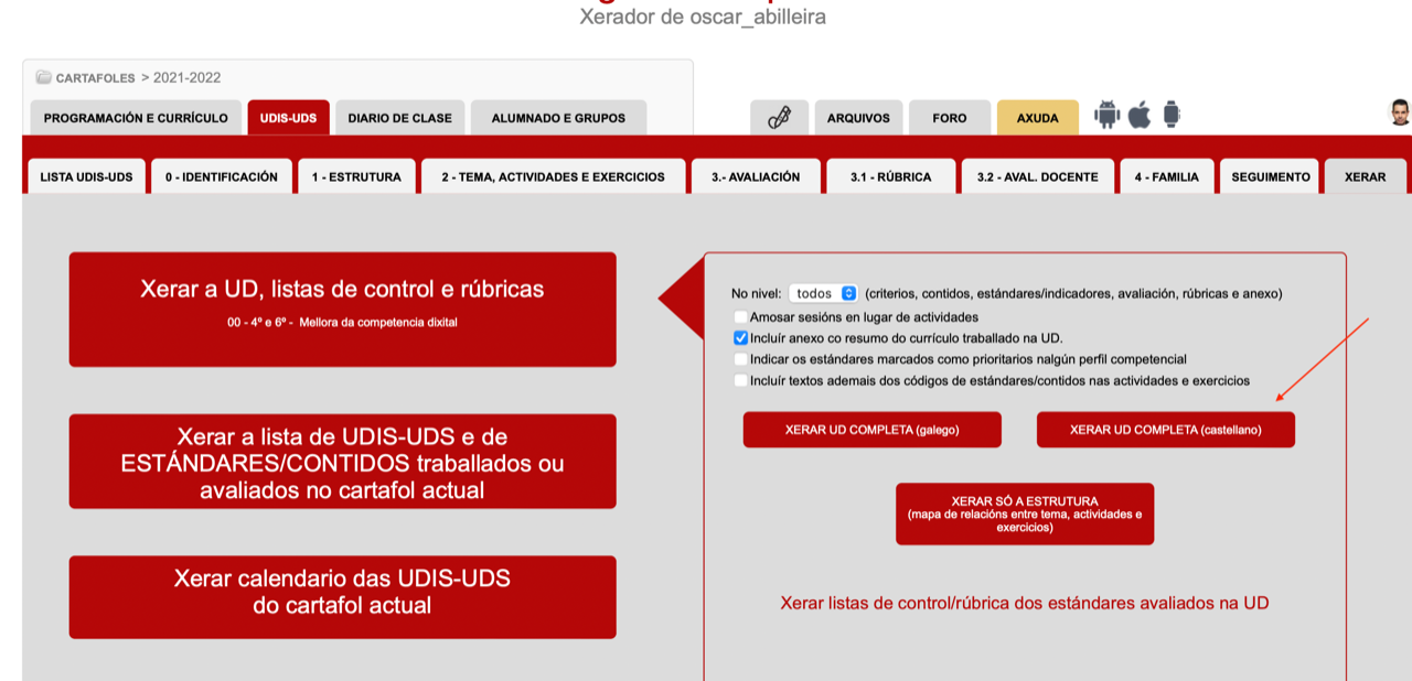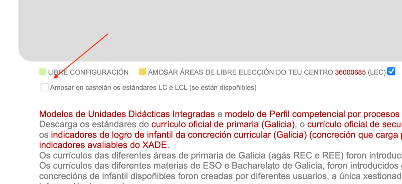 - O currículum que se inclúe é o de Galicia, e como tal oficialmente está en galego en tódalas materias/areas, e así se incluirá na UDI. Só hai a excepción das áreas/materias de Lengua Castellana y Literatura castellana, donde se pode elixir se queremos que aparezan os estándares en galego ou castelán, para elo terás que marcalo na parte inferior da aplicación, nesta opción (eso si o resto do curríclum aparecerá en galego):