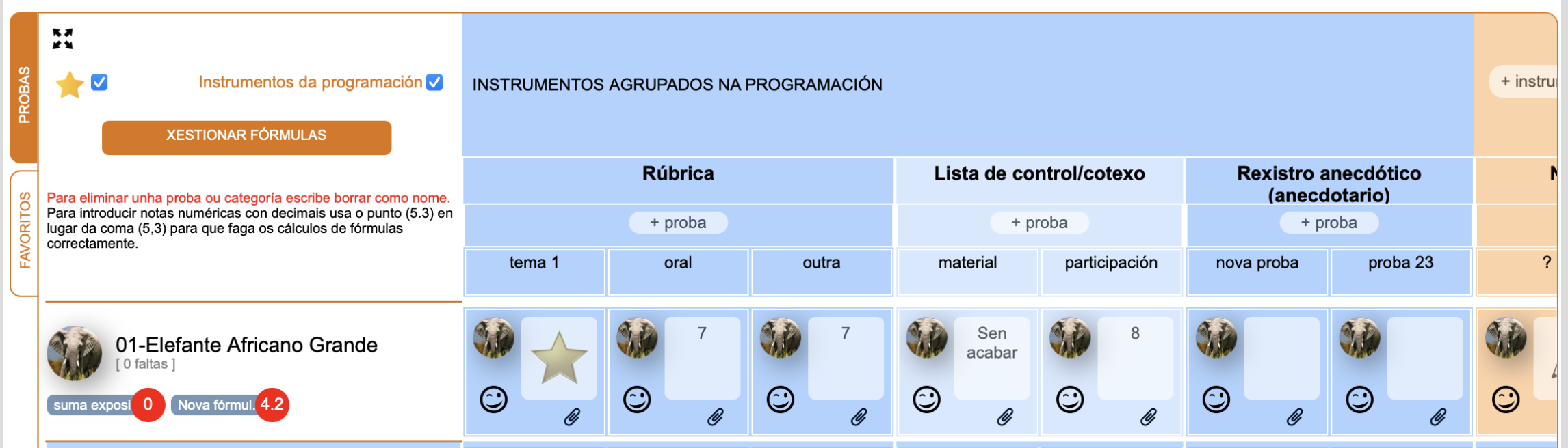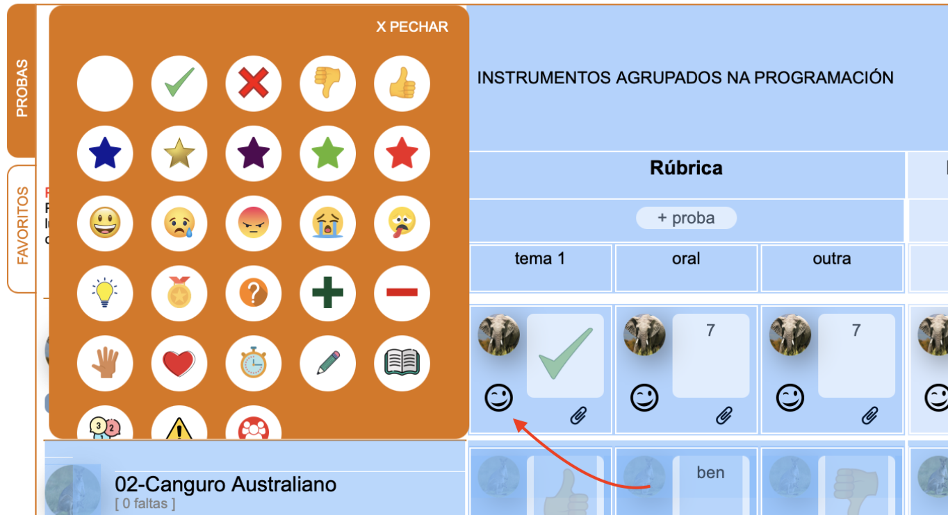- No **caderno do docente podes agora engadir tamén iconas** en lugar de notas numéricas ou textos, que poderás escollelas nunha unha lista oas dispoñibles. Borra a icona introducida escollendo o círculo de cor branca ó comezo da lista de iconas.